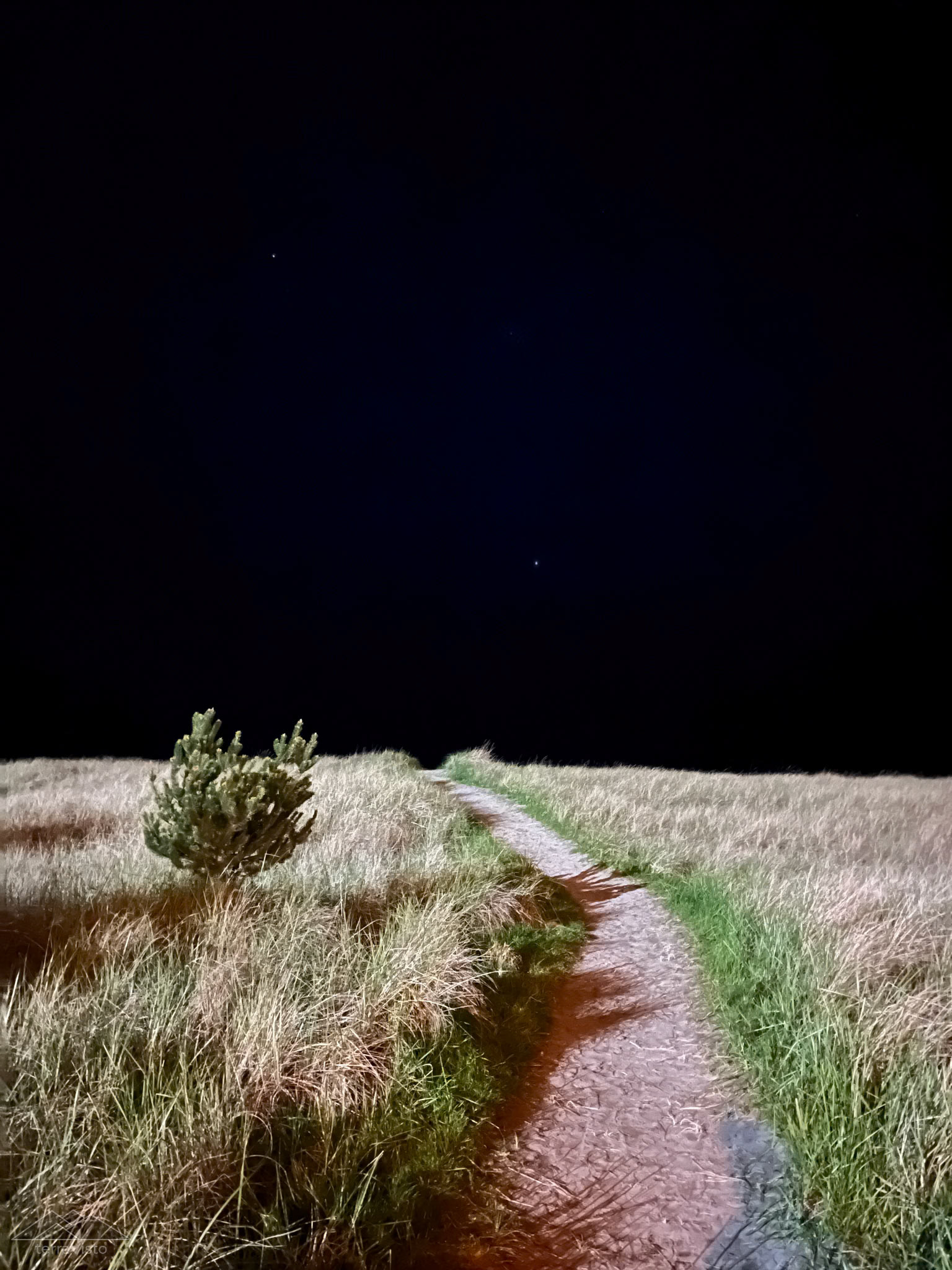 Night photograph of the dune path leading from the Promenade in Seaside out towards the darkness of the Pacific Ocean.